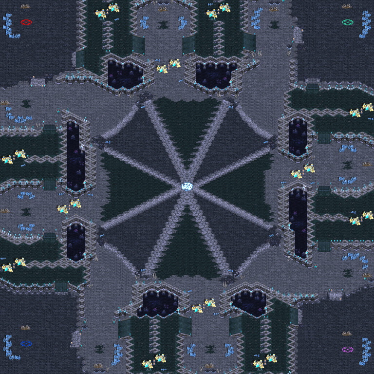 - 중립멀티 지역이 본진, 앞마당, 센터지역 모두와 연결되어 있고 각각의 경로에 어시밀레이터 관문이 놓여있는 컨셉맵이다.