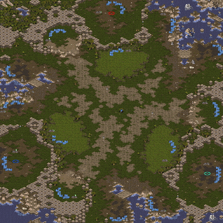 - 센터 멀티가 위치한 지형(Raised Jungle)은 언덕 지형처럼 보이지만, 실제로는 1층 판정으로 시야 제한, 회피 등의 언덕 판정을 받지 않는다.