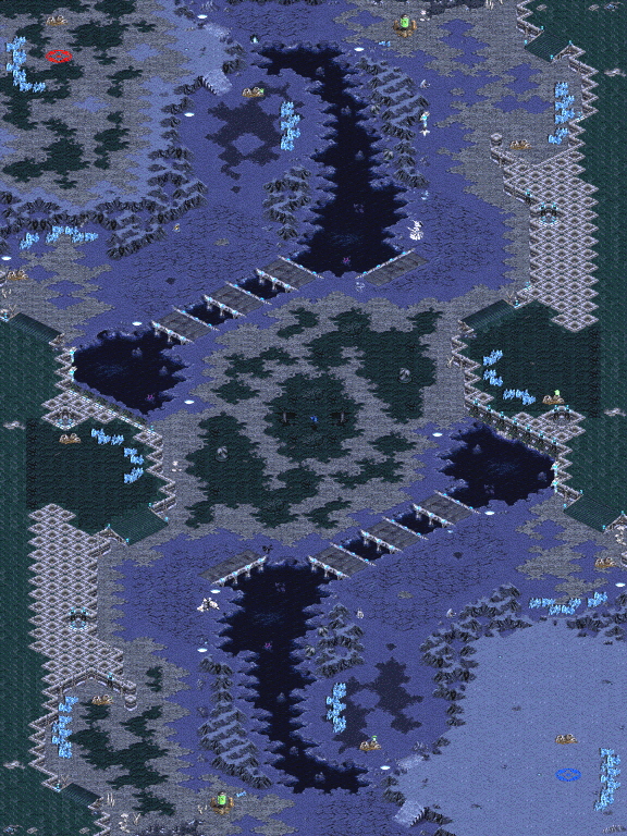 - 추가멀티로 통하는 우회로 및 본진과 바로 이어져 있는 뒷길 등을 이용한 난전 및 전략적인 플레이를 기대할 수 있다.