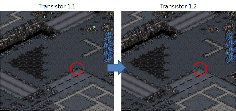 스타크래프트 자체 경로찾기 버그의 일종으로 보이며, 맵의 일부 지형을 수정하여 해결하였습니다. 변경 부분은 아래 사진과 같이 매우 작은 부분이라서 1.2 버전으로 수정하였습니다.