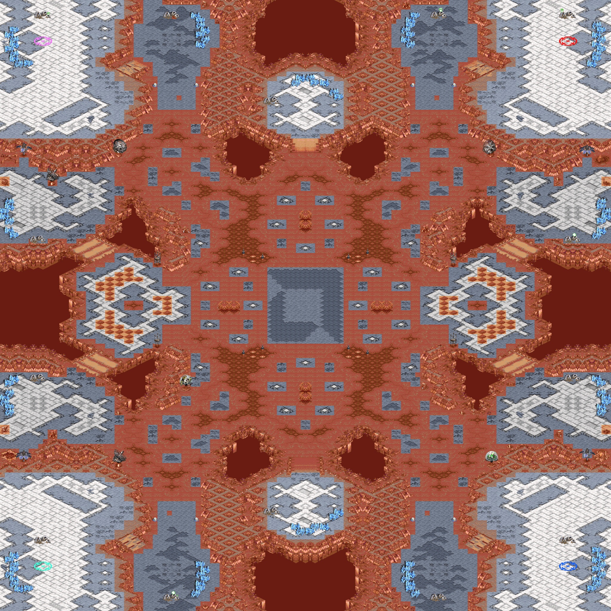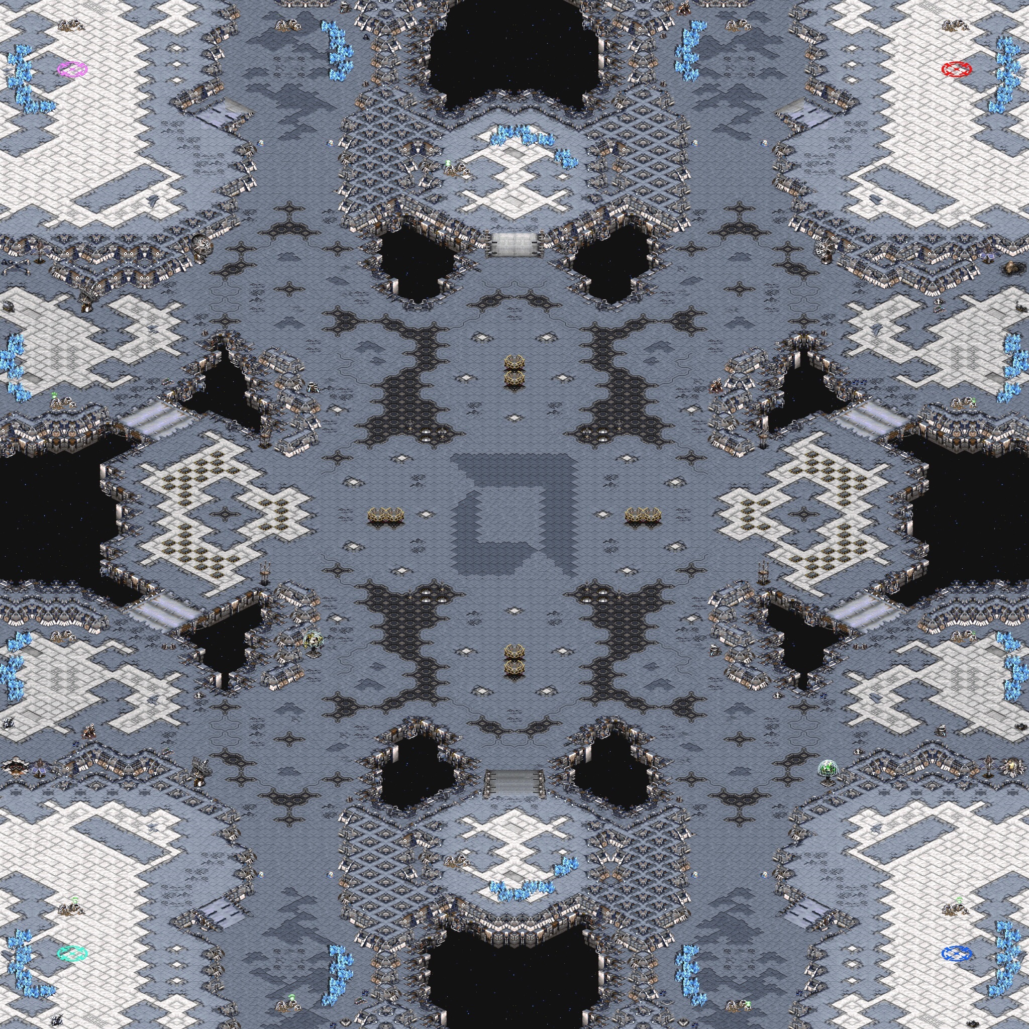 - 맵 전체적으로 건물 건설 불가지형 추가 - 센터에서 터렛 이어짓기는 가능하지만 정중앙 로고와 3시/9시 부근 제외하면 배럭 크기 건물 건설 불가능
