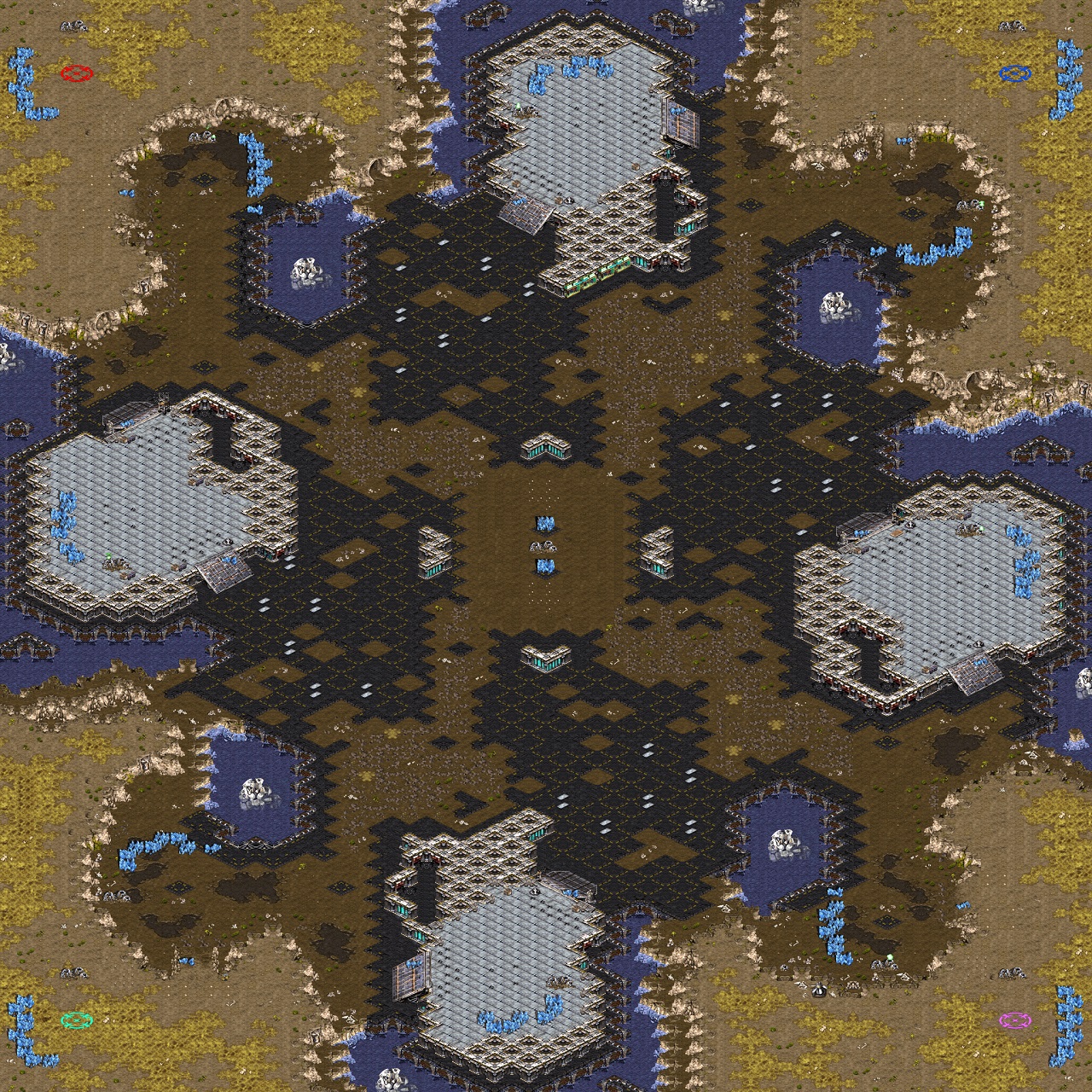 - 센터에 건물이 지어지는 지역은 정중앙 부근이며, 시계방향의 제2멀티로 가는 길목 일부에도 2x2 크기의 건물을 추가로 지을 수 있다.