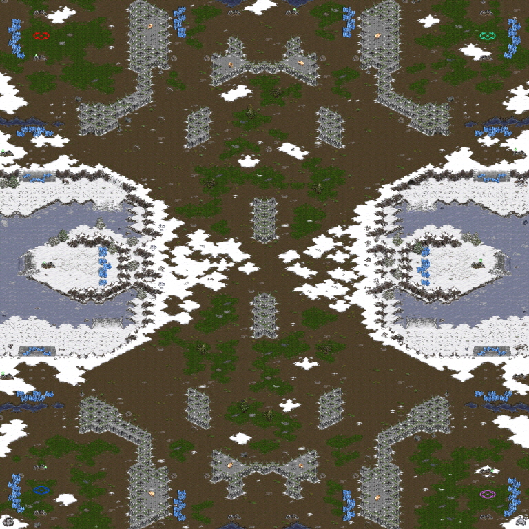 - 12시, 6시 멀티의 자원은 미네랄 - 가스 - 가스 - 미네랄로 일렬 배치되어 있어 원하는 방식으로 멀티지역을 가져갈 수 있다. 일반적인 가스멀티가 될 수도 있고 2가스 멀티가 될 수도 있다.